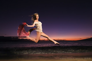 One of the disadvantages of the Canon flash system is that when using a flash off-camera, it disables 2nd curtain sync for some reason (I hear that Nikon users don't have this limitation). So when dragging the shutter to make the sky brighter, we started to get some dark blurs in front of Heather as she leapt through the air. This later had to be taken out in post.